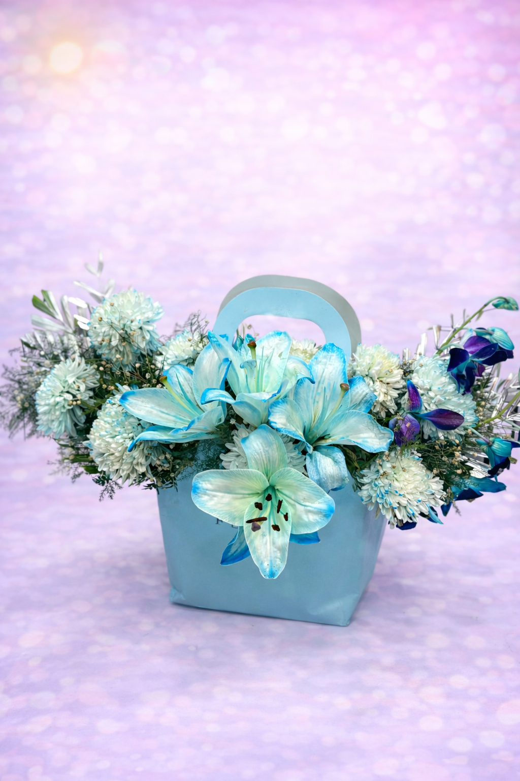 A cool and calming masterpiece, this arrangement brings together the rare beauty of blue-tinted lilies and exotic orchids. Set in a stylish light-blue handle bag, it is a sophisticated choice for those who love unique and artistic floral designs.
