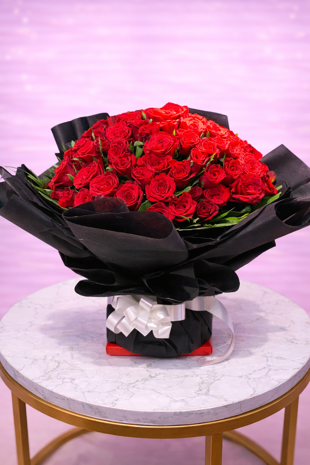 A breathtaking and premium floral arrangement that uses 100 roses to create a dense, perfectly rounded dome. This design is built for high-impact visual drama and long-lasting impressions.