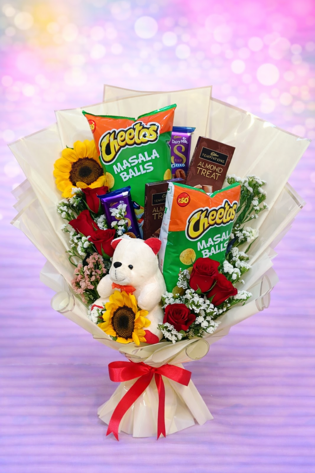 Floral Accents: Real red roses and bright sunflowers are tucked between the snacks to maintain that classic bouquet feel.