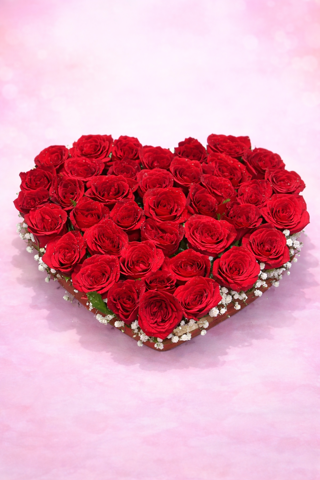 • Floral Composition: Features approximately 40 premium red roses tightly packed to create a continuous, velvety heart silhouette.