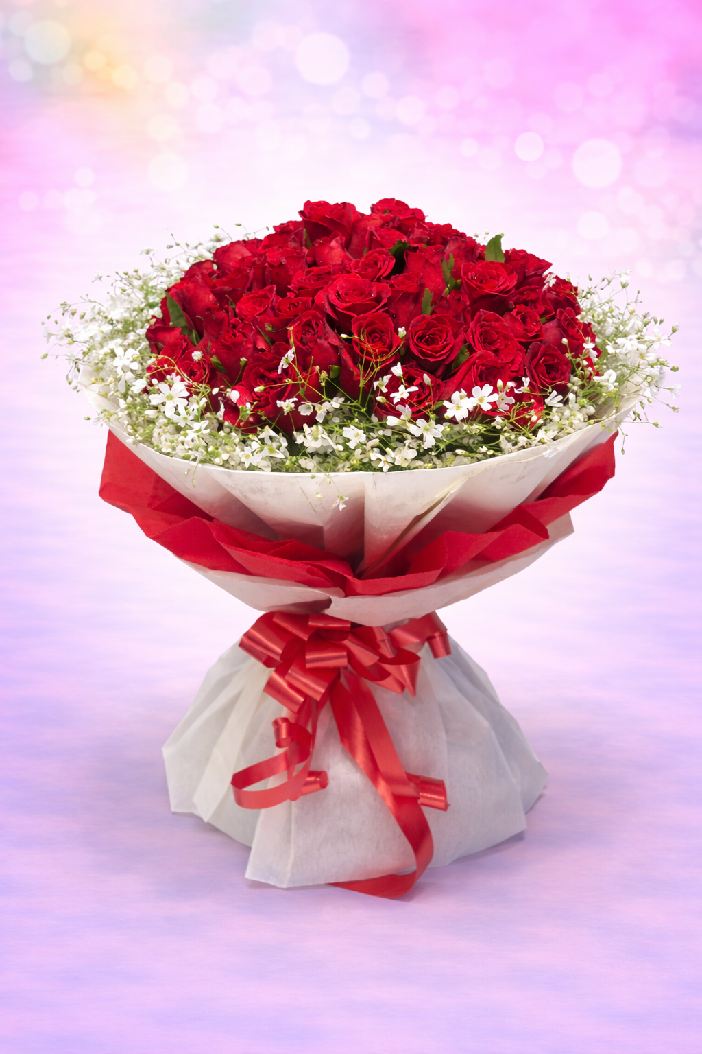Sparkling Border: Encased in a thick, snowy ring of white Baby’s Breath and delicate white star-shaped filler flowers, which adds a festive and bright contrast.