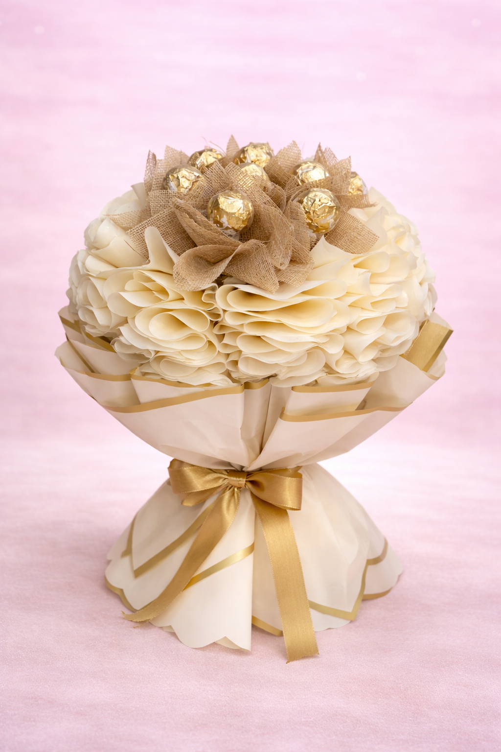 Ornate Wrapping: The chocolates are surrounded by extensive, ruffled layers of cream-colored Korean paper with gold-trimmed edges. The “heavy” folding technique makes the bouquet look dense and opulent.
