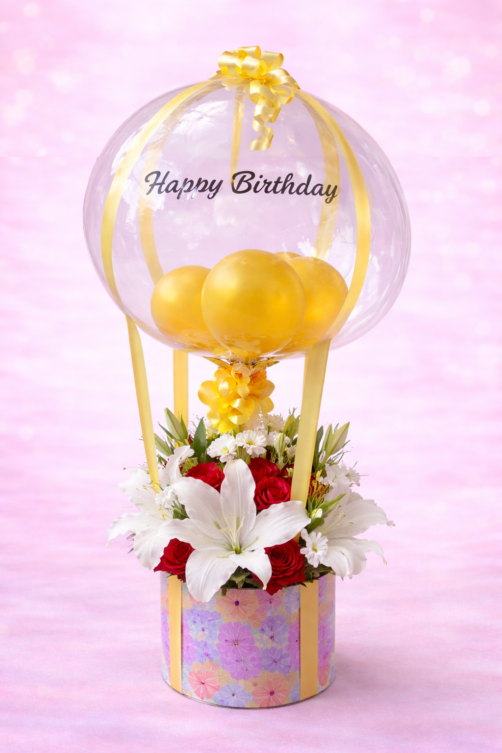 A creative birthday gift featuring a clear “Happy Birthday” bubble balloon with golden minis inside, rising from a box of white lilies and red roses.