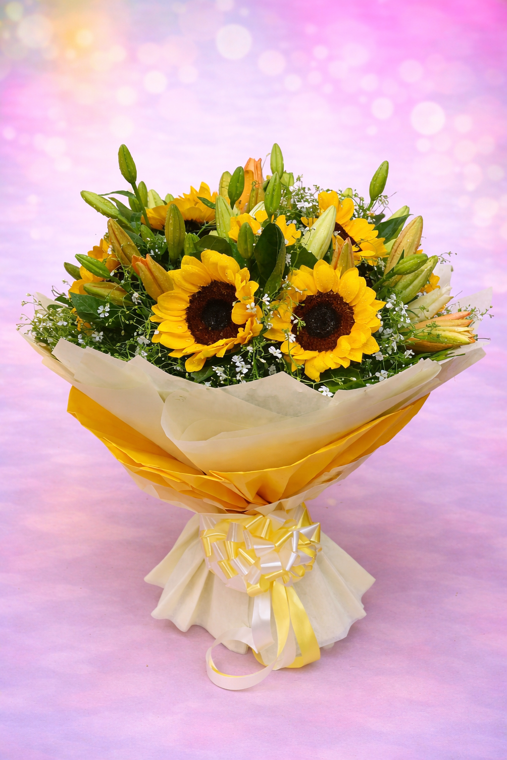 Bring the warmth of a sunny day indoors with this bright and high-energy bouquet. Centered around large, radiant sunflowers, this arrangement is designed to lift spirits and spread positivity.