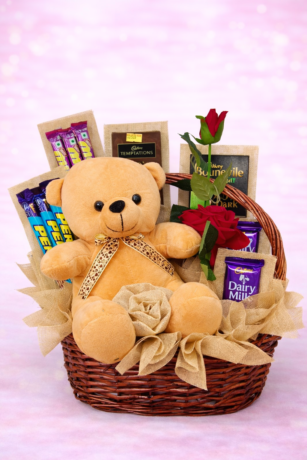 Premium Dark & Milk Selection: Includes a sophisticated mix of chocolates such as Cadbury Bournville Dark, Cadbury Temptations, Perk, and classic Dairy Milk bars.