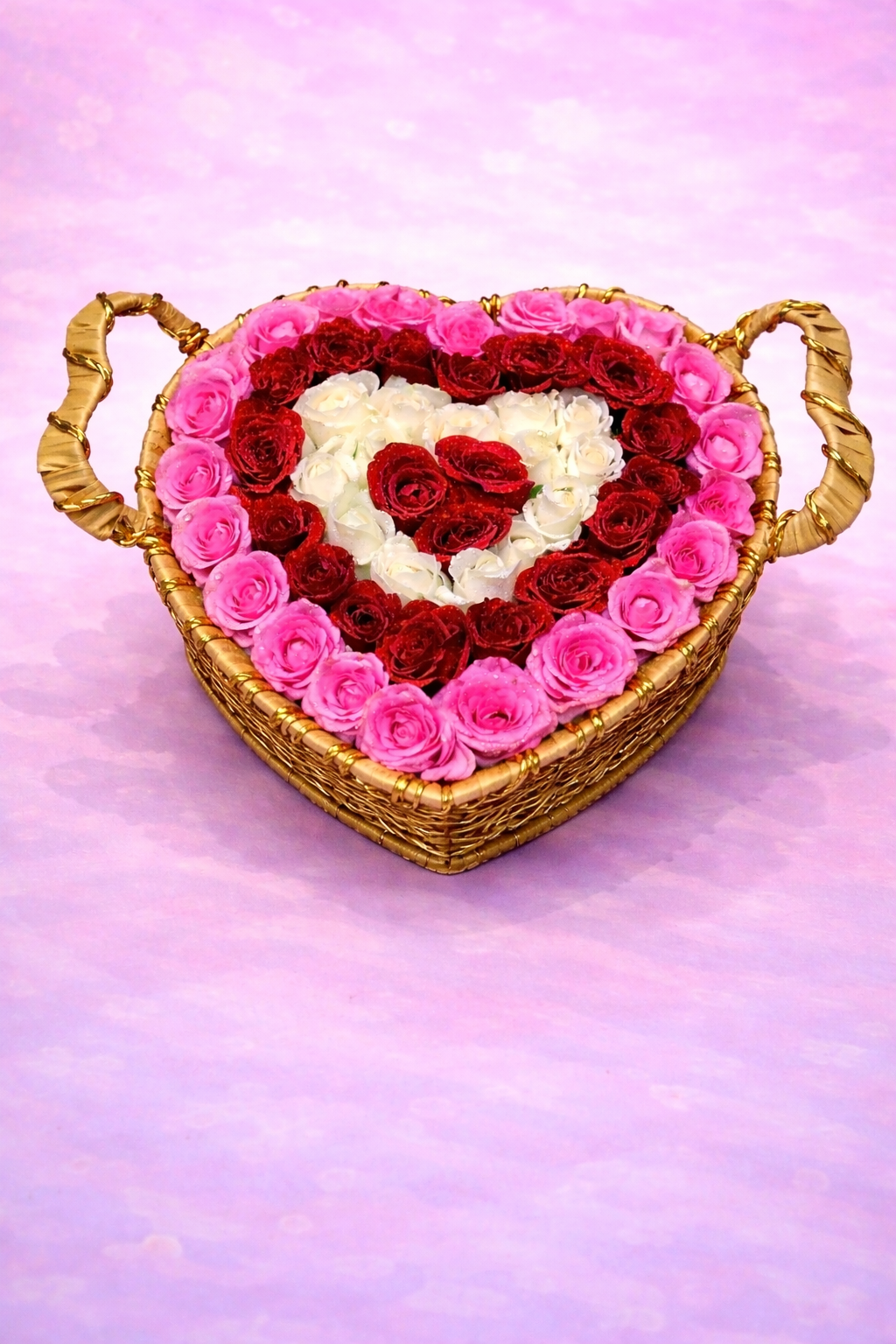 A beautiful heart-shaped basket featuring three layers of pink, red, and white premium roses in a handcrafted golden wicker base. A symbol of pure and layered devotion.